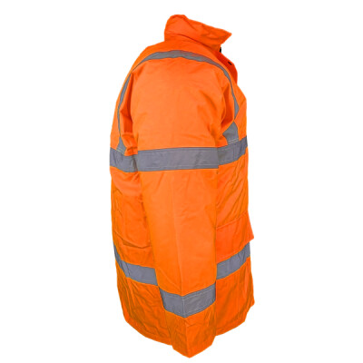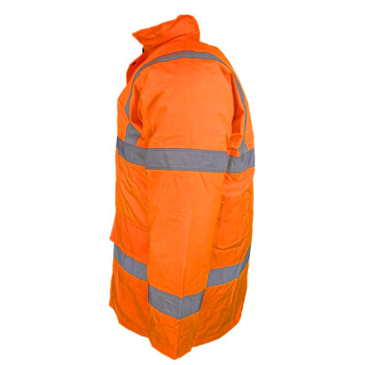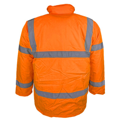 Conforms to EN ISO471:2013 Class 3 & EN343 against foul weather. Orange also conforms to GO/RT 3279. Waterproof PU coated Polyester with 190g quilted padding and Nylon lining. Heavy-duty zip with studded storm flap. 2 outer pockets with storm flaps. Knitted storm-cuffs in the sleeve ends. Concealed hood with draw cord adjuster. Inside breast pocket. Fully stitched and taped seams to ensure waterproof. Matching trousers available, reference HVS461, HVS462 & HVS463.